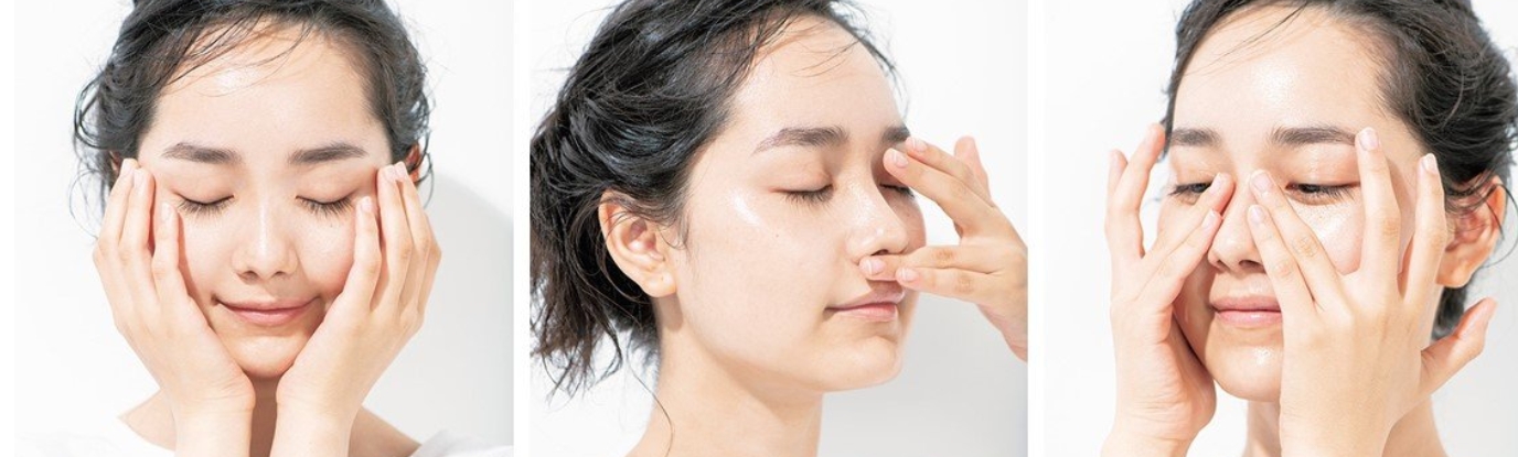 まずは500円玉大くらいの量を手に取り、顔の中央から外側、下から上に向かってゆっくり広げます。このとき、指先ではなく“手のひら全体”を使うのがポイントです。